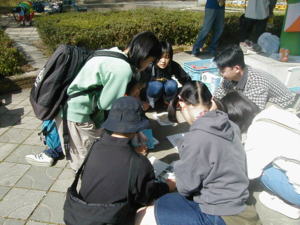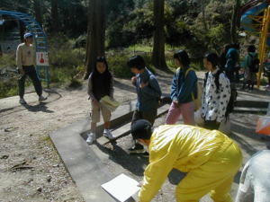 | 初めてのオリエンテーリング。 白川くんから説明を受ける中学生達。 しかし、コース設定が難しすぎ、 結局ペナになってしまいました。 また、中学生女子のみ表彰状が足らずに 渡せませんでした。後日郵送します。 すいません。大反省! |