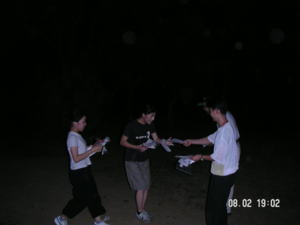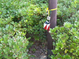 昼間のうちに、コントロール設置。 今回のコントロールは、反射テープ付き。 牛乳パックの再利用品です。 |