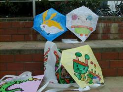 凧揚げ大会で使われた手作り凧。大宮子供会では、各凧に色々な賞をつけています。 |
