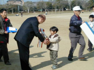 | さぁ、表彰です。 まずは、凧揚げ大会のトロフィー授与。 市長杯のトロフィーです。 そうそう、開会式には原市長も 来てくれていましたね。 |