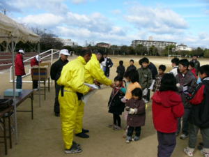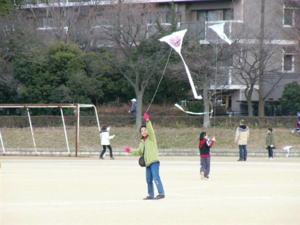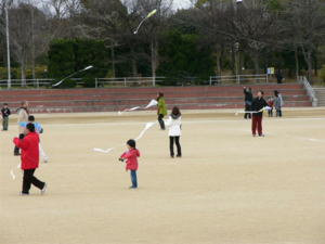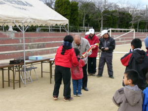 前半の凧揚げでは、 みんな元気に走り回っていました。 今回は風が寒いくらい吹いていて、 樹に引っかかったりして大変! 優秀者には、左の景品が! |