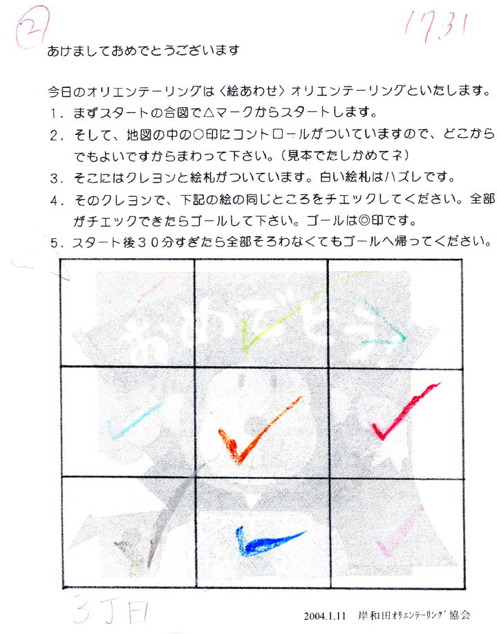 | 「あった!」 牛乳パックた色塗りしたコントロールに、 クレヨンがぶら下げてあります。 同じ絵が描いてあるところに、 その色でチェック!。 当たりは9カ所。 6カ所は、はずれです(´。`)。 |