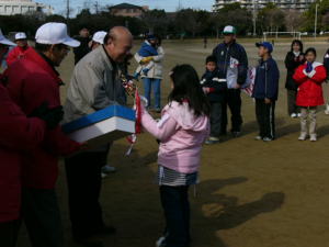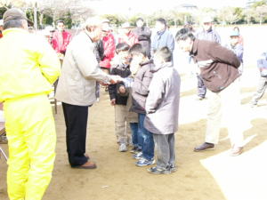 | さぁ、表彰です。 まずは、凧揚げ大会のトロフィー授与。 市長杯のトロフィーです。 |