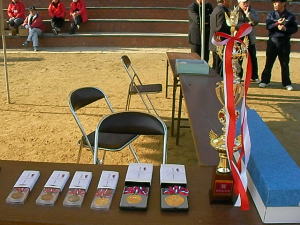 | さぁ、表彰です。 まずは、凧揚げ大会のトロフィー授与。 市長杯のトロフィーです。 オリエンテーリングの表彰も。 5チームに賞品が配られました。 |