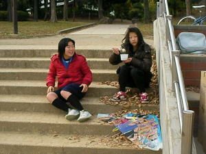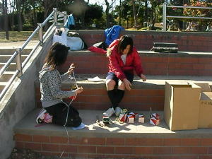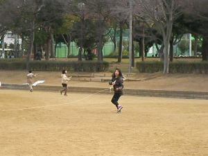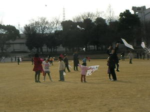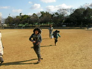 | 今回は、スキー野外活動部としても 凧を用意。(市販のものですが) オリエンテーリングまでの時間を 凧揚げをして楽しみました。 でも、風がなくて みんな四苦八苦。 |