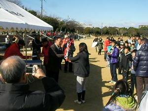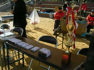 | さぁ、表彰です。 まずは、凧揚げ大会のトロフィー授与。 市長杯のトロフィーです。 オリエンテーリングの表彰も。 5チームに賞品が配られました。 |