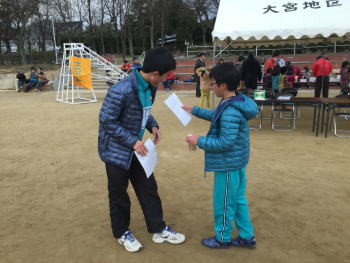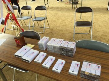 | さぁ、表彰です。 まずは、凧揚げ大会のトロフィー授与。 市長杯のトロフィーです。 オリエンテーリングの表彰も。 5チームに賞品が配られました。 |