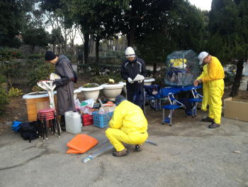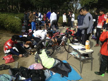 設置組と準備組に分かれて、 設置も完了。 ところが、事前に問い合わせて 「正月あけまで養生のため立入禁止」 と聞いていた部分が、みごとにオープンに。 直前にコース変更までしたのに(-_-;)。 スタート直前に告知することで、対応しました。 |