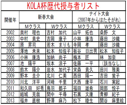 男女最上位クラスに参加している方で、過去12年間にKOLA杯を受賞していない成績最上位者に授与されるもので、「KOLAティーシャツ」と「KOLA大会年間無料招待券」の2点を進呈します。