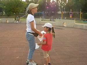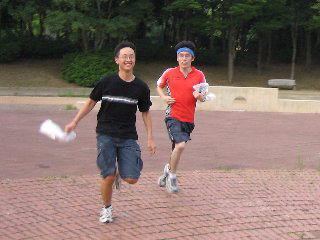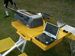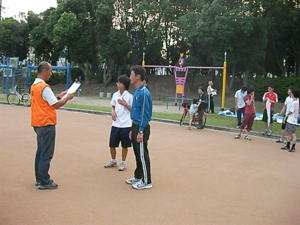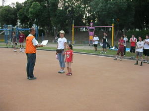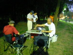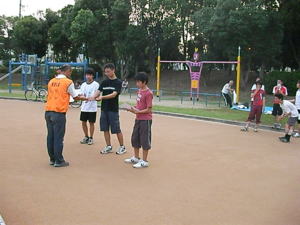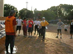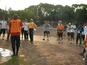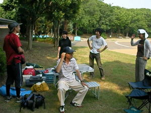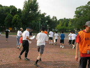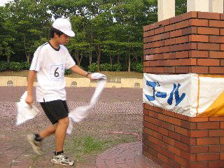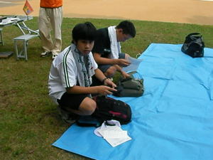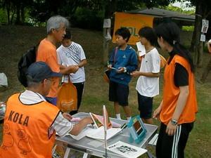 今回、初めての「たそがれ」。 夕方の涼しい時間帯で オリエンテーリングを楽しみましょう。 KOLAで作ったミニ応援旗。 発電機も府協会で購入??。 待ち時間には、DVDで世界選手権の 様子などを流しました。 |