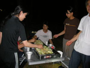| 焼きそばで軽く、夕食。今回運営の7人です。 | |