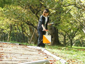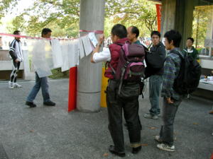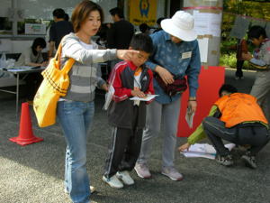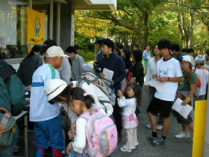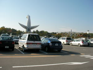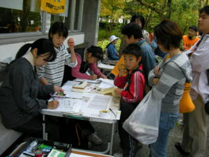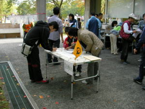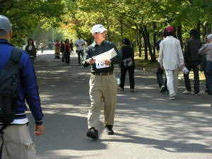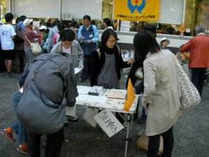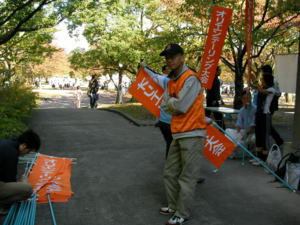 万博公園での 府民大会第2戦。 当日は、フリーマーケットをしていたため 文化園の駐車場は、朝から満杯。 荷物を運ぶ目印に、幟を立ててみました。 |