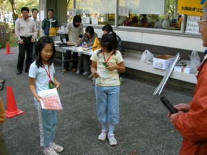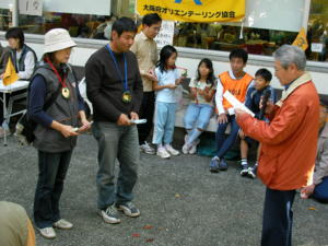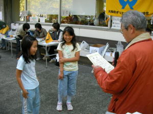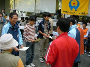 表彰式です。 手作りのメダルと、ハンドタオルの景品です。 |