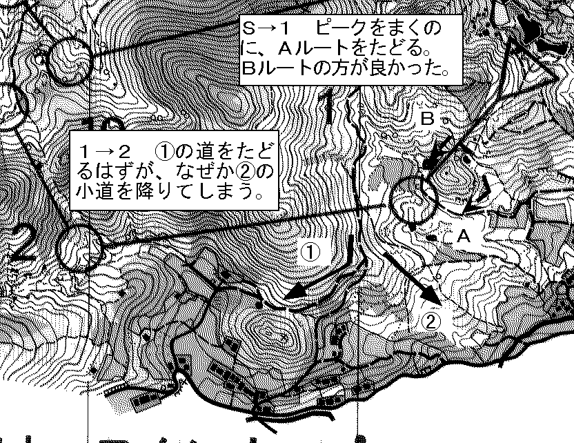 1→2で、手前の道をたどり、ちがう方向へ降りてしまう。