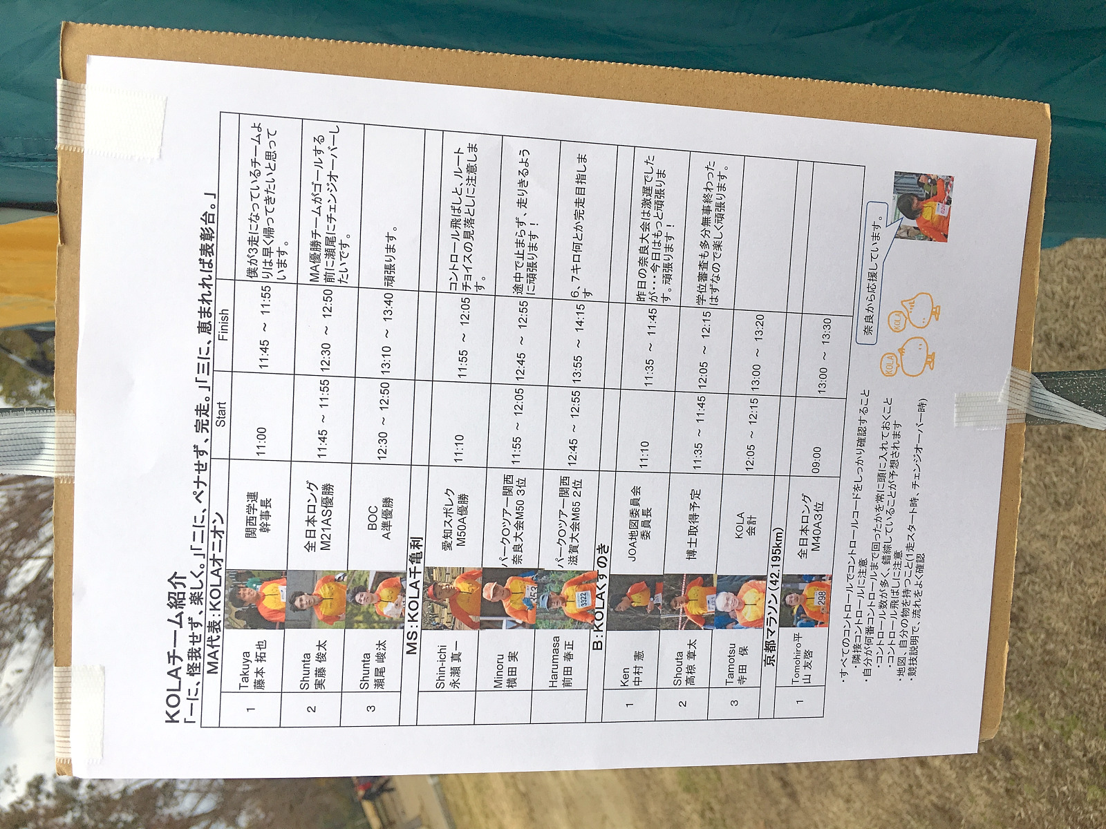| 永瀬監督からのコメントです ウエスタンカップリレーに参加いただいた皆さま お疲れ様でした。 近接コントロールが多く、disq祭りの中 皆さん確実に回っていただき、目標を達成することができました。 目標 一に、怪我せず、楽しく。 → 達成 二に、ペナせず、完走 → 達成 三に、恵まれれば、表彰台 → MS3位で達成(まさに恵まれて) ※タイム的には、荒れない展開で、 皆さん、計画どおりのタイムを達成しました。 MA代表 KOLAオニオン(藤本→実藤→瀬尾) ※ふるはうす、みやこ、OLPの上を目指そう※ ☆OLPには、及びませんでしたが、ふるはうす、みやこに勝ち 朱雀、京都、京大、阪大のdisqもあり 過去最高の5位 MS KOLA千亀利(永瀬→横田→前田) ※恵まれれば(2チームに順位がつかなければ)、表彰台※ ☆MSに、MV世代2名+XV世代1名で挑み 京都OLCに走り勝ち、OLPのDISQがあり 3位入賞(2年連続の入賞) B KOLAくすのき(中村→高椋→寺田保) ※恵まれれば、表彰台を目指そう※ ☆3位まで3分31秒差の4位でした。 -- 今回、いつもの各チームの計画スケジュール(添付ファイル)に 京都マラソンの平山君の計画も書いておきました。 13:00〜13:30としたところ、計画以上の走りで 12:52:34にフィニッシュされていました。(3123位3:48:45) ということで、本日は、10名とも目標を達成できたことになります。 お疲れさまでした。 |