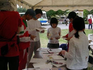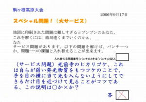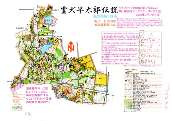 | 受付で、 クイズやコントロールについての 説明を聞いて、スタート。 下の写真は、「菅ノ台クラス」の各ポイント。 横田選手は、約90分かかって 全部回ってきました。 クイズは、観光案内所でできるかぎり 聞いてました(^_^;)。 |