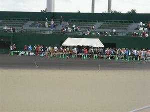 | 7時30分。 アルプス球場のセンター付近の 外野にターフを張る。 |
